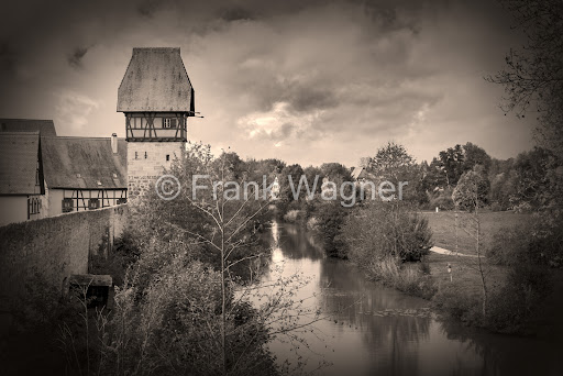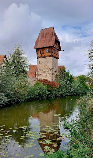 If there is a typical landmark or symbol of recognition for Dinkelsbühl, then it is undoubtedly the Bäuerlinsturm. It is part of the town fortifications of the western part of the town wall and borders directly on the Wörnitz river that runs along it. It is a rectangular, brick tower with a half-timbered extension and hipped roof. It is best seen from the adjacent Wörnitz or Schwedenplatz square