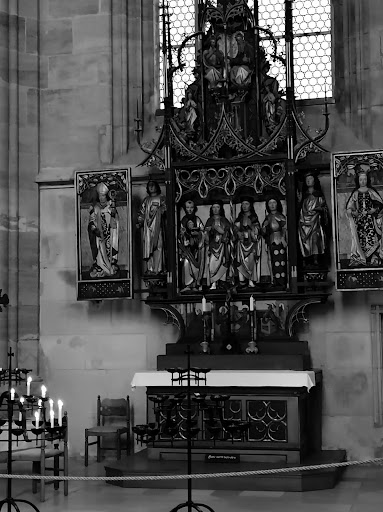 Altars: The Sebastian altar (1520) and Trinity altar (1500) in the south aisle, the cross altar (after 1470) and the neo-Gothic Joseph altar in the north nave, the ciborium altar with Pieta in the ambulatory (1490) was in the 17th century destination of numerous pilgrims. The baptismal font, pulpit and sacraments house are artistic stonemasonry from the time it was built. The famous "pretzel window" indicates a foundation of the bakers' guild.
