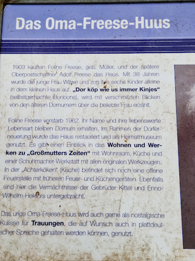 Read moreDas Haus ist Bestandteil des Rundgangs durch die "Historische Altstadt". Das Museumshaus ist liebevoll eingerichtet und zeigt anschaulich das frisische Landleben damaliger Zeit, eingebettet in die Geschichte der Oma Freese. Auf dem kleinen Rundgang durch die Altstadt sind die historischen Häuser mit kleinen Erklärtafeln versehen. Es ist durchaus spannend und sehenswert...