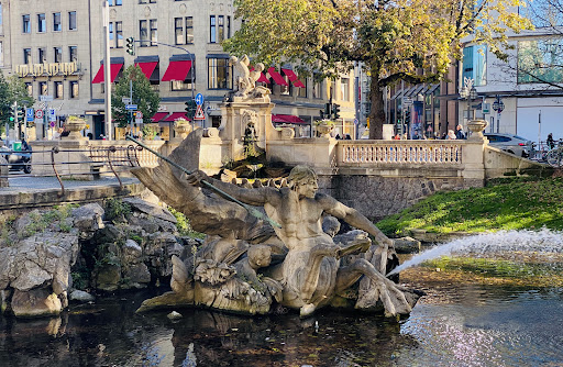 Tritonenbrunnen:- This fountain depicting the Greek god Triton sits in a city canal surrounded by shops & cafes.The Triton Fountain was created by the Düsseldorf sculptor Friedrich Coubillier from 1898 to 1902 and acquired by the city beautification association for Düsseldorf's Königsallee .The fountain figure of the Greek sea god Triton , armed with a lance, holds back a huge water-spouting fish, which is fought at the side by two small, naked water children. The group of figures rests on artificial rocks and is surrounded on the sides by mussel shells with...