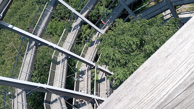 On a nice and quiet Friday morning with warm weather we walked through the beech tree forest from the campsite to this tree top path. A trail of over a km high in the canopies. On the way she info about the steigerwald, the Bavarian forest where it is located. some good info on the positive impact of forests, their good ecosystem services. But also a lot about the forestry teams harvesting trees, thus killing them... The children liked the trail for wooden balls. For two euro you buy a smooth wooden ball and it rolls along the trail. There's even a ball lift. Big fun. Nice playground as well and good coffee. Hiking options are abundantly available. Worth a visit,...