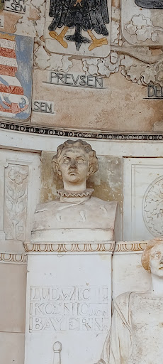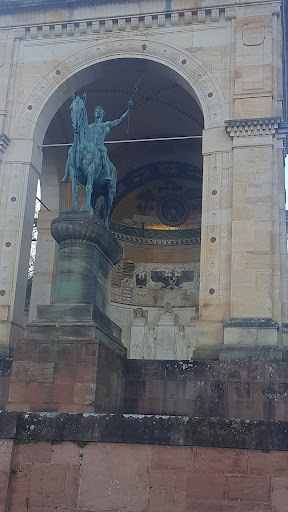 Das Denkmal ist mit Ornamenten und Fresken verziert. Oben die Wappen der ehemaligen deutschen Staaten und deren Vereinigung zum Deutschen Reich. Darunter die Büsten von König Ludwig II. von Bayern (yep, genau der), Kaiser Wilhelm I. und Prinzregent Luitpold von Bayern. Dabei große Steintafeln mit Inschriften. Vor der Halle die Reiterfigur eines nackten Jünglings, der einen Ölzweig in der Hand hält und als Zeichen des Friedens emporstreckt.