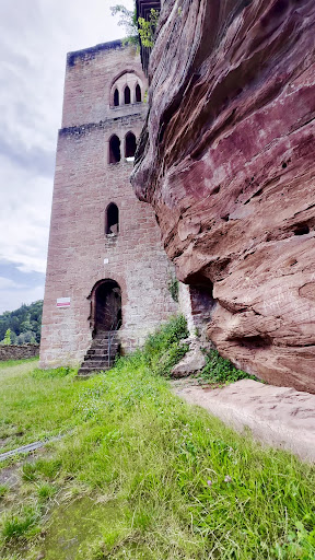 Burg Frankenstein im gleichnamigen Ort in der Nähe von Kaiserslautern hinter Hochspeyer. Von Hochspeyer kommend hat man 2 Möglichkeiten auf die Burg zu kommen. Die erste ist gleich am Kiosk wo es auch öffentliche Toiletten gibt und 500 Meter weiter am Parkplatz zum Friedhof. Wenn man hoch zur Burg sieht fällt einem auch gleich die Kirche auf die am Hang steht und das stilvolle Tunnelportal . Durch die Bahndurchführung folgt man zwischen Friedhof und Kirche der Beschilderung den steilen Serpentinen den Burgberg hinauf. Der schmale Pfad ist aber leicht zu bewältigen. Oben angekommen hat man einen frein Blick auf die Burganlage. Links in einer Schutzüberdachung sind Informationen und Pläne der Burg ausgestellt und man bekommt einen ersten Eindruck über das frühere Aussehen der Burg. Die Burg war wohl leicht anzugreifen da kein Graben oder ähnliches Schutz bot. Auch diese Burg wurde durch einbeziehen der vorhandenen Felsen erbaut wie man an den vielen behauen Burgwänden und in Fels geschlagenen Stufen sehen kann. Vor jedem Fenster sind steinerne Sitzbänke gemauert die einen Träumen lassen. Wenn man oberhalb des Wohnbaus steht kann man das Kaminfeuer knistern hören und riechen und man bekommt Lust auf den Fensterbänken mit Tierfellen Platz zu nehmen und die Aussicht zu geniessen. Vom Bergfried aus hat man einen wunderbaren Rundumblick ins Tal und auf die Bahnstrecke.