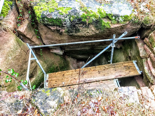 Nach dem Abstieg vom Bergfried folge ich der Burgmauer zum Eingang zum großen Saal und kann rechts über dem Eingang den Erker / Balkon sehen. Im großen Saal ist der knisternde Kamin und von oben kommt gerade jemand mit duftendem Braten... Hundegebell reist mich aus den Tagträumen und ich stehe vor dem von oben verschlossen Aufgang der zerfallen und nur wenige Bruchstücke von Stufen aufweisen auf eine Treppe. Vom ehemaligen Boden des Saals ist leider nicht mehr zu sehen außer Matsch und Wasser... Mit dem letzten Foto verabschiede ich mich von der Burg nicht ohne Versprechen wieder zu kommen... Dem Felsen folgend geht es einige Stufen auf den schmalen Pfad nach unten. Mit einem letzten Blick auf dem Foto festgehalten geht es sanft den Berg in Serpentinen bergab bis zum Bahnhof und dem Kiosk. Kurz vorm Ende wird man noch über die naturnahe Beweidung des Burghangs aufgeklärt. Wieder im Ort angekommen mache ich mich auf den Rückweg zum Auto und kann so noch einiges über die Geschichte von...