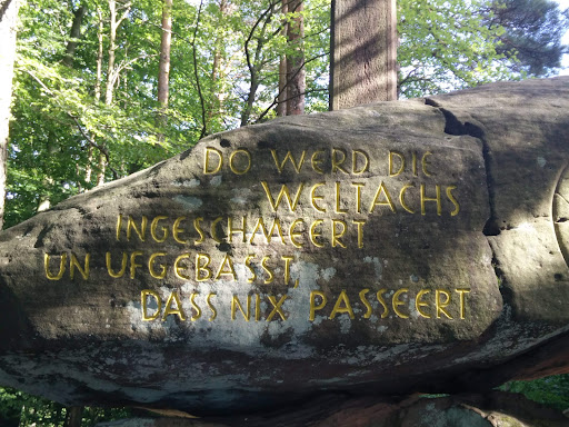 Pfälzer Tradition! Einmal im Jahr wird die „Weltachse“ feierlich „neu geölt“. Ihre Darstellung bezieht sich auf Die Pälzisch Weltgeschicht von Paul Münch, die mit dem Gedicht Mer Pälzer un die Weltachs beginnt. Dort heißt es, dass die Weltachse sich im Mittelpunkt des Pfälzer Staates (die Pfalz in den Grenzen des Rheinkreises) befände und den Pfälzern seit der Schöpfung die Schmierung der Weltachse anvertraut sei. In enger Anlehnung an den Text lautet die Inschrift auf dem Felsen: "Do werd die Weltachs ingeschmeert unn uffgebasst, dass nix passeert (Hier wird die Weltachse eingeschmiert und aufgepasst, dass nichts passiert).