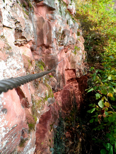 Die beiden ersten Kletterpassagen sind zwei SandsteinwĂ€nde links oberhalb des Pfads. Die FĂŒĂe stehen in einem waagrechten Riss, mit den HĂ€nden hĂ€lt man sich besser im Fels, denn das Seil hĂ€ngt schön locker durch und wehrt sich damit gegen die Benutzung.