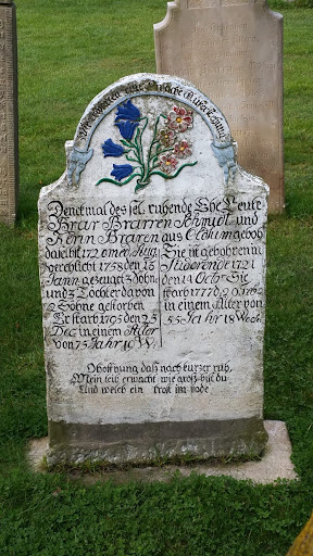 Um die Kirche herum liegt ein großer alter Friedhof mit sehr schönen alten Grabsteinen. Es wurden Menschen aus allen umliegenden Dörfern hier bestattet. Man sieht auch die Verschiedensten Grabsteinausführungen.