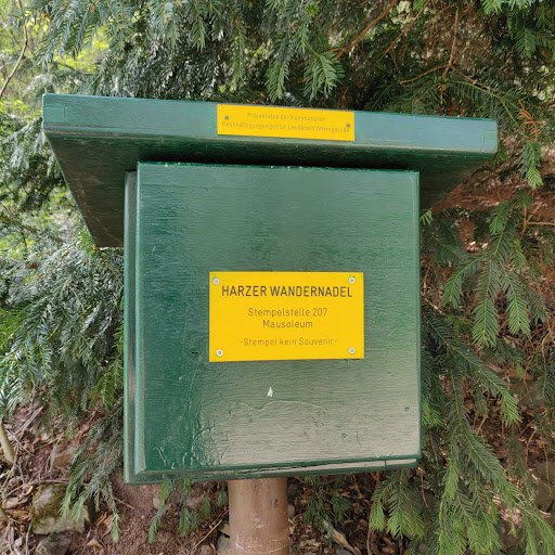 Direkt neben dem Mausoleum befindet sich ein Stempelkasten der Harzer Wandernadel Nr. 207. Er ist gut angebracht, da er nicht genau am Mausoleum ist und man so ungestört seinen Stempel setzen kann.
