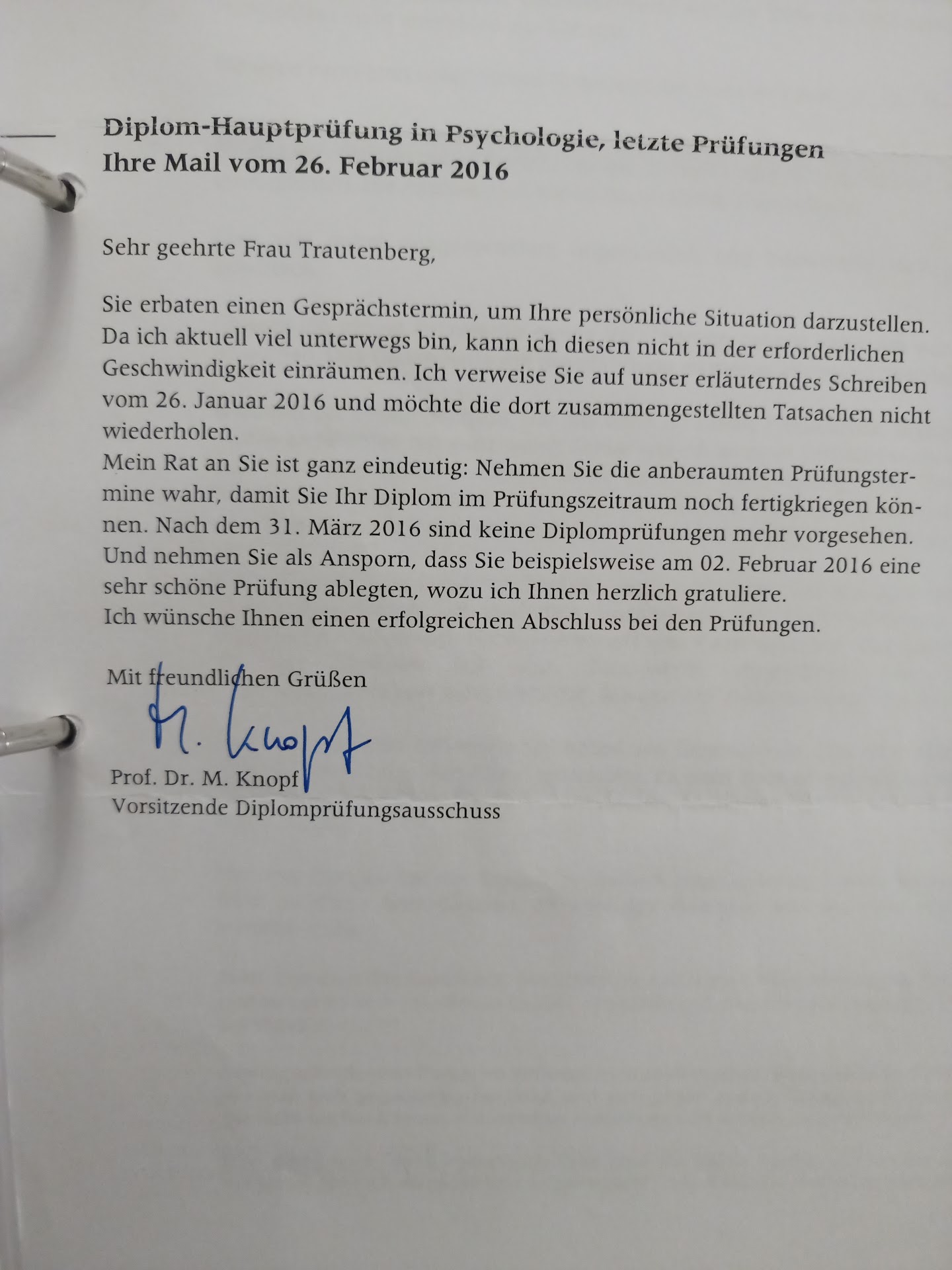 Von Psychologen hatte ich Verständnis erwartet. Dass ich mich hier im Irrtum befand, stellte ich bereits fest, als ich zu Beginn der Prüfungsphase die Prüfungsvorsitzende der Diplomstudiengänge, Frau Prof. Knopf, um eine Berücksichtigung meiner Umstände, auch im Hinblick auf gute Leistungen, bat. Sie lehnte per Brief ein persönliches Gespräch aus „Zeitgründen“ ab. Ihr gleichzeitiger Glückwunsch für bis dahin erbrachte Prüfungsergebnisse klangen dabei für mich wie Hohn.