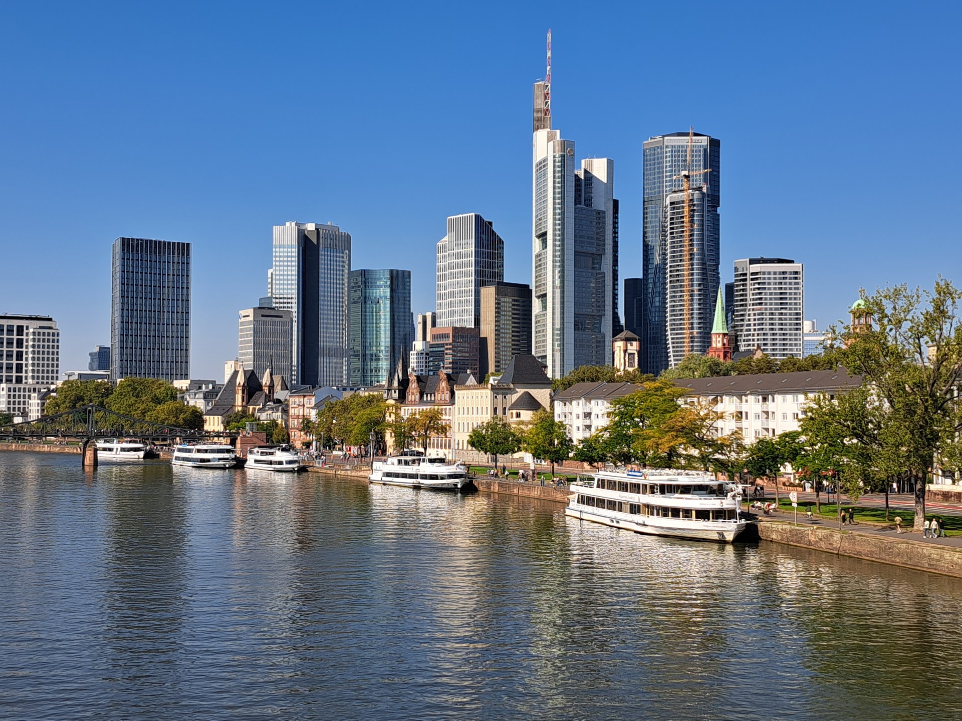 !!!!!!!!!!!!!!!!!!!!!!!!!!!!!!!!!!!Wow---PHOTO OP MUST!!!!!!!!!!!!!!!!!!!!!!! This is a perfect vantage point to take pictures of the financial district , the old city and the lovely Main River. Bring your Camera or phone and get ready to snap away Alte Brücke (German: "old bridge") is a bridge in Frankfurt, Hesse, Germany. It is the oldest bridge over the lower course of the river Main, and until 1886 was the only stone bridge crossing the river. From the Middle Ages until the year 1914, it connected the "Fahrgasse" in Frankfurt Altstadt with the "Brückenstraße" in Sachsenhausen. Since its first mention in official documents in 1222, the development of Frankfurt has been strongly influenced by the bridge. Over the centuries, Alte Brücke has been destroyed and reconstructed at least 18 times. With its 13 brick-built circular arches, the Sachsenhausen Bridge was one of the most prominent buildings of the city, but failing to meet the increasing demands of the modern road and ship traffic, it was demolished in 1914.