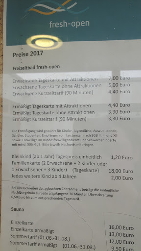 Read moreDas Fresh-Open ist nach der Renovierung deutlich ansehnlicher geworden. Der Umkleidebereich ist ansprechend gestaltet, auch farblich. Ein schönes Willkommen, wenn man ins Bad kommt. Auch der Aufenthalt war angenehm. Eines hat mich jedoch sehr gestört. Ich kann es mir als Berufstätige unter der Woche nicht leisten, schon nachmittags ins Bad zu gehen. So komme ich erst in den Abendstunden dazu. Das Bad schliesst laut Öffnungzeiten-Übersicht wochentags um 21.30 Uhr. Die Dame an der Kasse teilte mir schon mit, dass bereits um 21.00 Uhr die Badezeit endet. Das finde ich persönlich schon zu früh, denn ich brauche für das Duschen/Umkleiden keine 30 Minuten. Wäre auch ein komisches Verhältnis, wenn man bei dem angebotenen Tarif des Schwimmbads über 90 Minuten 2/3 der Zeit für das An- und Ausziehen benötigt. Als ich jedoch um 20.45 Uhr (also 45 Min. vor Schliessung) noch in das Außenbecken gehen wollte, wurde mir vom Bademeister gesagt, dort sei bereits geschlossen. Ich empfinde das als absolut kundenunfreundlich. Die Stadt sollte sich überlegen, ob die Arbeiten, die allabendlich zu tätigen sind, wirklich so früh in den Öffnungszeiten zu legen sind. Jedes Geschäft hat allabendlich Reinigungsarbeiten durchzuführen und ich kenne kaum Läden, in denen diese in die Öffnungszeiten fallen. Es ist bereits Jahre her, dass ich in einem Bekleidungsgeschäft in Frechen 10 Minuten vor Geschäftsschluss den Staubsauger zwischen meinen Beinen herumsaugen sah, was ich als absolut unpassend fand.... Ich selber arbeite selbständig und gerade deshalb weiss ich sehr genau, was Kundenfreundlichkeit bedeutet. Ähnliche Erlebnisse mit viel zu frühen Aufräumarbeiten hatte ich übrigens in der angeschlossenen Sauna beim Fresh-Open. Bereits eine Stunde vor Schliessung wurde bereits deutlich aufgeräumt.... Wellness geht anders. Daher höchstens 3 Sterne für das Bad und in den Abendstunden kann ich mir einen Aufenthalt dann leider nicht mehr einrichten....