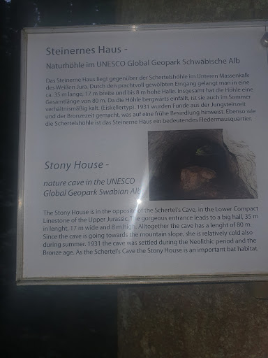 Read moreDas steinerne Haus ist eine kleine Höhle in unmittelbarer NĂ€he zur Schertelshöhle. Etwa 200 Meter Luftlinie entfernt. Sie hat ein schönes und groĂes Eingangsportal und ist im inneren Bereich etwa 8 Meter hoch und ca. 35 Meter lang (zugĂ€nglicher Bereich). Sehr gute und lohnenswerte Alternative wenn man an der Schertelshöhle Wartezeiten am Eingang hat. Im Winter sollen sich im Inneren unzĂ€hlige...