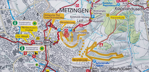 Read moreSehr interessanter und schöner Weinwanderweg, mit Blick auf Metzingen und Umgebung. Auf vielen Tafeln kann man viel über die hiesige Weinbautradition, Rebsorten, geologischen Aufbau und Metzingen erfahren. Trotz des steilen Geländes vermeidet die Wegführung große Anstiege, und somit kann die Wanderung auch von weniger sportlichen Menschen...