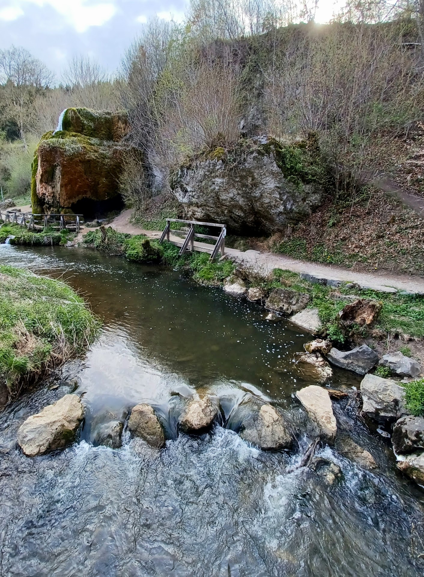 Der Wasserfall ist zwar nicht der Größte, jedoch in seiner Art schon besonders. Durch den hohen Calciumgehalt ( 200mg/Liter) des Wassers, wächst dieser Wasserfall und dass kann man sogar fühlen. Am Wasserfall wächst viel Moos, dieses wird durch das Wasser befeuchtet, durch Verdunstung entsteht hier Calciumcarbonat, dieses bindet sich am Moos und erhärtet. Der Wasserfall wächst. Man denkt das Moos sei weich, jedoch ist es an vielen Stellen verkalkt und hart. Genauere Beschreibung auf einem der Bilder. Auf dem Rückweg lohnt sich ein Besuch der Nohner Mühle mit ihrem urigen Aussenbereich.