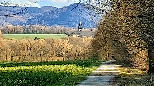 Die Kirche ist eingebettet in das Gelände von Gut Grauhof und umgeben von schönen Waldstücken und Ackerflächen. 🌲🌳🌳🌿 Direkt über die Straße kann man Alpakas bewundern, die jedoch nicht gefüttert werden dürfen. Die Besitzer bieten auch Alpakawanderungen an. 🦙🦙🦙🦙 Es gibt Spazierwege zum Fliegerhorst oder auf der anderen Seite der Hauptstraße bergab auf der rechten Seite gibt es Wege durch den Wald entlang an Teichen. 🦢🦆 Ein Besuch lohnt sich definitiv, da es genug drumherum anzuschauen oder zu erwandern gibt.