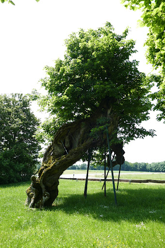 Eine alte Sommerlinde. Der Stamm ist in niedriger Höhe abgebrochen und übrig ist ein mächtiger Ast, der mit vielen Stangen gestützt wird. Das Innere des Stammes / Astes ist hohl und wird mit Eisenstangen zusammengehalten. Der traurige Rest eines früher sicher mächtigen Baumes, sieht er aber auch sehr bizarr aus. Der Baum ist sehr bemoost aber scheint noch OK zu sein. Sein Alter kann nur geschätzt werden. Irgendwas zwischen 600 und 800 Jahren könnten es sein, was ihn zu einem sehr alten Baum machen würde. Gleich nebenan eine weiterer, jüngerer, aber weitaus größere und im klassischen Sinne prächtigere Linde, die ihr irgendwie Konkurrenz macht. Ein Rastplatz lädt zum...