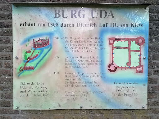 Schön anzusehen und um mal einen Spaziergang zu machen, jedoch hat die "Burg" kein nennenswertes Alleinstellungsmerkmal. Im Vergleich zur Burg Ingenhoven, wo es einen Park mit Teich, ein Restaurant in der Burg selbst und eine Anbindung zur Fußgängerzone gibt. Wenn man von dem Biotop, was von der Burg Uda ein paar 100 Meter entfernt ist und von der Niers absieht, ist es einfach nur ein Turm im Wald, den man durchaus mal besuchen kann, aber das wars auch schon...es ist auf jedenfall nichts besonderes und man hätte die Umgebung, einladender und Charakteristischer gestalten können.