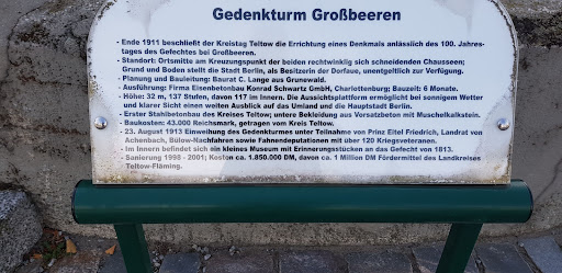 Der am 23.8.1913 zum 100 jährigen Jubiläum eingeweihte, 32 m hohe Gedenkturm erinnert an die Schlacht vom 23. August 1813, die hier im Rahmen der Befreiungskriege gegen die französische Armee Napoleons bei strömenden Regen stattfand und zugunsten der Preußen entschieden wurde. Auf Seiten der Preußen kämpften etwa 100.000 Mann (auch russische und schwedische Truppen) in verlustreichen Nahkämpfen von denen etwa 4.000 ihr Leben verloren, unter der Führung von Freiherr Friedrich Wilhelm von Bülow (Großonkel von Loriot) und Bogislav Graf von Tauentzien (an ihn erinnert auch die Tauentzienstrasse in Berlin am KaDeWe). Der Sieg verhinderte ein erneutes Vordringen Napoleons nach Berlin und beendete die französische Herrschaft in Brandenburg. Jährlich wird diesem Ereignis ein Volksfest gewidmet, wo in historischen Uniformen und mit nachgebauten Waffen ein kleiner Teil der Schlacht nachgestellt wird. Im Turm befindet sich ein kleines Museum mit weiteren Erläuterungen und Darstellungen dieses historischen Ereignisses. Am Fuße des Turms befindet sich übrigens, etwa 100 m entfernt, eine sehenswerte, über 120 Jahre alte Lokomobile als "Dampfwalze", die als Vorläufer der Verbrennungsmotoren parallel zur Lokomotive entwickelt wurde. (Aber die sollen ja auch schon bald wieder verschwinden ...). Nur wenige hundert Meter entfernt finden Sie übrigens die sehenswerte "Schinkel Kirche", die fünf Jahre nach der Schlacht ebenfalls aus Dankbarkeit...