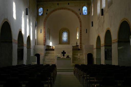 Heute Evangelische Gemeindekirche mit dem ältesten Kirchturm im Südwesten: frühromanisch, 2009 wurde auch die Krypta aufwändig restauriert mit ihrer imposanten Mittelsäule und den schönen Fresken, ein kühler Ort in der Juli-Hitze und Ort der Besinnung auf das Wesentliche des Lebens. Nur wenige hohe Stufen führen hinab zur Krypta, wenige hinauf in den Chor, der bereits gotische Fenster hat und nicht zugänglich ist. Lichtdurchflutet ist der große Kirchenraum, man fühlt sich zuhause im Hause Gottes. „Dem Herrn gehörig“ ist die Übersetzung des Namens der Kirche = St. Cyriakus, dem Diakon gewidmet, der im Jahr 303 als Märtyrer starb und der als einer der 14 Nothelfer verehrt wird. 990 Jahre nach seiner Enthauptung wurde diese Kirche katholisch geweiht, nach dem Übertritt der Stadt zum Evangelischen Glauben wurde sie evangelisch. Alle Menschen sind hier willkommen, neue Kraft zu finden in dieser beeindruckenden Stätte...