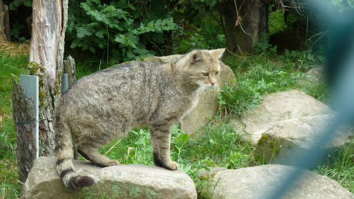 Als Katzenfreunde und wenn man mal im Hainich ist, sollte man sich das Wildkatzengehege in Hütscheroda auch ansehen. Denn sonst bekommt man die selten gewordene und scheue echte Wildkatze niemals zu Gesicht. Es lohnt sich allerdings nur zur Fütterungszeit, denn auch in ihren Gehegen kommen die hervorragend getarnten Tiere nicht auf Befehl zum Bestaunen angerannt. Es sind eben Katzen, und Katzen kann man nur mit Futter bewegen. Jedoch hatte ich mir unter WildkatzenDORF schon irgendwie was anderes vorgestellt. Man kommt in das o. g. Dorf, parkt sein Auto an der Wildkatzenscheune, wo man den Eintritt für das Gehege bezahlt (5,50 Euro pro Person) und in einer Ausstellung Wissenswertes über die Wildkatze und den Hainich und Artenschutz erfährt. Dann läuft man straff einen Berg hinauf bis zum Gehege. Es gibt vier Kater in je einem eigenen Gehege. Wie gesagt, außerhalb der Fütterungszeit sind sie kaum zu sehen. Der Wildhüter erklärt viel zu den Tieren während der Fütterung, was auch echt interessant ist. Wir haben dann festgestellt, dass wir zu Hause eine enge Verwandte dieser Wildkatzen haben - unsere Katze sieht haargenau so aus wie einer der vier Kater. Auch wenn der Einritt etwas teuer erscheint für dieses Dejà vus, man tut immerhin was für den Artenschutz. Seit 2019 gibt es noch zwei Luchse zu bestaunen. Fast noch niedlicher waren übrigens die frei laufenden Mäuse, die ihrer Bestimmung als Futter...