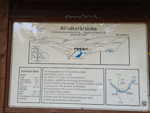 Read moreDer Transport des Erzabbaues erfolgte mittels Kähnen über Gräben entlang der Freiberger Mulde. Um die Höhenunterschiede auszugleichen wurden Kahnhebewerke gebaut. Die altväterbrücke ist das größte erhaltene Bauwerk dieser Gesamtanlage. Die besonders dicken Pfeiler auf der einen Brückenseite waren das Fundament für einen weiteren bogenförmigen Aufbau, welcher das Huthaus mit dem grabensystem...