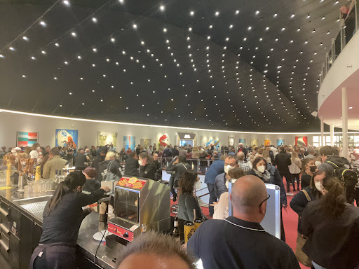 Die Sanitäranlagen sind ausreichend und sauber, in der Pause will natürlich jeder gehen.. also hier vielleicht lieber ausharren. Im Saal angekommen ist die Orientierung äußerst schwierig. Es gibt keine Beschilderung wo sich welche Reihe und welche Stuhlnummern sich auf welcher Seite des Saals befinden. Erst auf den dritten Blick erkennt man kleine Nummer direkt an den Stühlen. Es ist also nichts für eine schnelle und geregelte Platzsuche. Auf den Plätzen angekommen mussten wir feststellen das es keine Becherhalter gibt, man ist also gezwungen sein Getränk die ganze Vorstellung lang in der Hand zu halten. Das Abstellen auf der Brüstung, im Gang oder irgendwo anders wird sofort von einem Mitarbeiter geahndet. Dies versperre die Fluchtwege und sei gefährlich für die Elektronik. Gleiches gilt übrigens für Jacken welche auf dem Geländer vor dem eigenen Sitzplatz abgelegt werden. Ich muss dazu sagen, dass wir uns auf dem Rang befangen und der Fluchtweg somit den Sprung in ca 6 Meter tiefe bedeuten würde. Nun sitzt man also mit seiner Jacke auf dem Schoß (man hätte sie ja auch einfach für kleines Geld an der Garderobe abgeben können 😜) und dem Getränk in der Hand (Eiskönigin Sammelbecher 0,5 Liter Fassungsvermögen für 2 Euro plus 2 x 3,60€ Afri Cola 0,2 Liter = 9,20€ für eine Getränk von 0,4 Liter) auf seinem Platz und muss feststellen daß man nicht viel Platz hat. Mit meinen 1.70 und ca 80kg reizte ich meinen Sitzbereich mehr als aus. Trotz aufrechtem Sitz hatte ich nur noch ca 5 cm Platz zur nächsten Sitzreihe und wurde links und rechts bereits leicht gequetscht. Anfangs noch ein Grund zum Lachen, nach 30 min einfach nur noch unbequem (bin aber selbst schuld, hätte ja vorher nicht noch die trockene Brezel rein stopfen müssen 😜).
