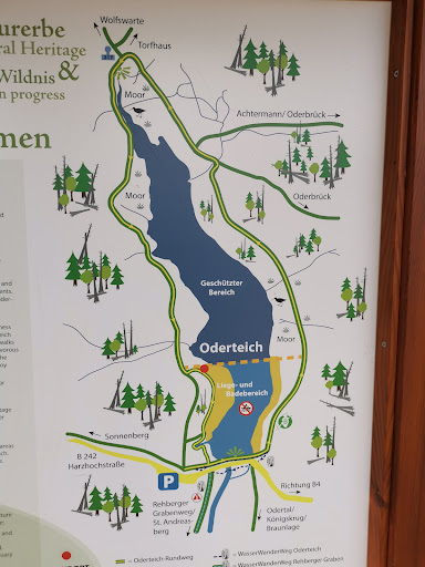 Oderteich is about 6 km from the Torfhaus. It's easy to get there by car. The roads are very good and marked with signs so it is easy to find it even without the navigation. There are a lot of tourists in the area. The lake is surrounded by forest roads but is not open along its entire length. One part is closed as a nationale park reserved just for animals, birds to protect them in their natural habitat. There are no restaurants or cafes nearby. The closest are in Torfhaus or in St. Andreasberg so it is best to take everything with you for the picnic, hiking. The paths are easy to walk, they are not steep, but there are a lot of pine roots which are growing here in there natural habitat. The Sonnenberg ski area, Brocken's the highest peak, is also nearby, so in case someone comes from another region or country can combine a visit for a few days with other tourist attractions. The nature is very beautiful, there are many paths. I can gladly recommend it for families with children and for all nature lovers. The surrounding forests are mostly pine but there are also some birch and beech. From animals, you can usually see foxes and hawks, and sometimes also lynxes. Two hundred meters from the lake, on the main road you can park your car on the large parking space. Parking is free and unpaved, it is covered just with ordinary rubble. The best that you wear shoes adapted for water and mud. You need around 1,5 hour to walk around the lake. In some places, pine trees grow, which are among the oldest in the Harz and are about 300 years old. In the summer is possible to swim in the water because it is not very deep. The water has a rust color, so it is not transparent in all parts. I did not see any fish in there so I can not say or if there are a kind of fisch in the lake. I wish you...