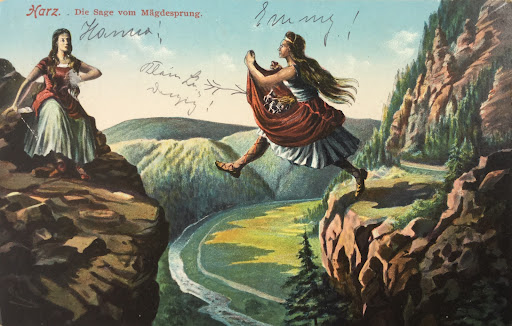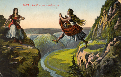 Der Name Mägdesprung stammt aus einer Zeit als noch Riesen und Menschen zusammen in unserem Lande wohnten. Eben in dieser Zeit waren zwei junge Riesinen, jede schätzungsweise etwa 18 m hoch, im Harz verabredet, um den neuesten Tratsch auszutauschen. Die eine war von Thüringen, die andere von der Börde den Harz hinaufgeklettert. Bei ihrer Verabredung unterschätzten sie jedoch die schon damals beachtliche Tiefe und steilen Abhänge des Selketals. Die Thüringerin, vom Auf und Ab des Südharzes völlig außer Atem, rief der Riesin auf der anderen Seite des Sekletals zu, sie möge doch zu ihr hinüberspringen. Die Angerufene, aus dem Flachland etwas höhenängstliche, zögerte. Da rief ihr ein die Szene beobachtender Bauer zu: „Sie ist so groß und wagt den Sprung nicht!“. Verärgert packte da die Magd den Bauern, samt seines Fuhrwerks, auf dem er Holz geladen hatte, und sprang mit ihm über das Selketal. Der Ort am Fuße des Berges auf welchen die Magd sprang wurde fortan, was liegt näher, Mägdesprung genannt. Der Bauer blieb der Überlieferung zufolge unversehrt. Die Riesenteenager hatten einen tierischen Spaß. ...Ja ja...