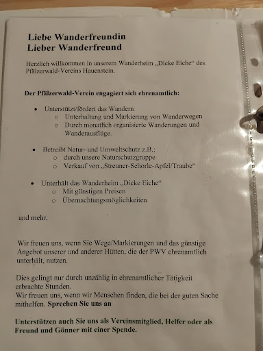 Read moreEs ist zwar ein sehr anspruchsvoller Weg zum Wanderheim. Von Hauenstein aus nach oben zum Wanderheim dicke Eiche. Doch dafür hat man einen fantastischen Blick auf das Tal. Getränke und Essen gut, eben eine Pfälzerhütte. Selbstbedienung....es gibt hier Übernachtungsmöglichkeiten . Das Ambiente war auch uhrig. Man kann von oben auch schöne Wanderwege besteigen, nach Hauenstein Dahn, Erfweiler Busenberg- Schindhardt. Alles in allem echt toll. Wir genießen Weinschorle und ein kleines deftiges Essen. Leberknödel- Bratwurst Sauerkraut. Sehr...