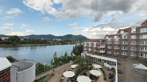 Beautiful river side hotel with a picturesque view. "* No access to the river banks. The hotel is on the main road, it is pretty easy to get to with a rental car. The underground parking entrance is a little narrow by US standards. The hotel feels a little aged, the rugs are worn, the elevators are very squeaky and loud (avoid the rooms near the elevators if you have sensitive ears)and there an odd scent of an old rug. The room is a traditional Marriott style, cozy and comfortable. The bed and comforter is nice and soft, with 2 long pillows. The work desk is very functional, you can put multiple displays in the desk. Extra scores, for the air-con, you can actually set the temperature and fan speed. Usually this is not the case for many hotels in Europe. The internet was a little slow, I got a dowbload speed of about 10Mbps, good enough to stream movies at HD. If you have an access to the Executive lounge, it is truly beautiful dinning watching the sunset on the outdoor balcony taking in panoramic view of the river. The staff stationed at the Executive lounge is very friendly and helpful, she can speak multiple languages fluently. As far as I know she is fluent in German, English, and Spanish. I would say she is a good representative of an ideal Marriott employee. Overall we had a pleasant stay. Thank you 🙏👍