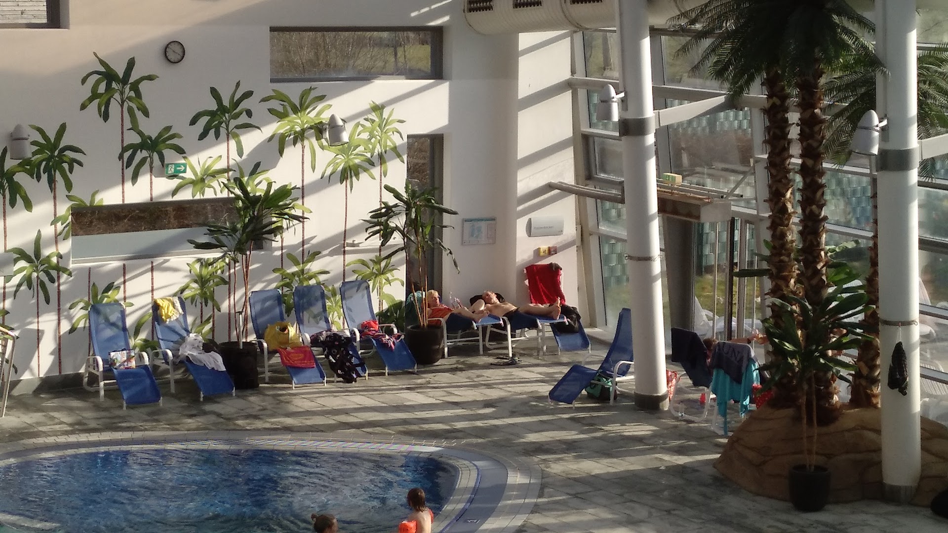 From the outside the place has great appeal with modern architecture and smooth surfaces, however once inside the age of the building shows. The changing rooms are packed full with changing booths and lockers with little room to maneuver around. There is only one male and one female shower room with 5-7 shower heads. The pool area is cramped with chairs along the edges forcing you to side step past them. The concrete walls show signs of water damage and paint peeling all over. The two indoor “hot” pools were actually mildly warm with only small sections of bubbling water. The area with the children’s pool and area was very nicely layout, however most of the kids were in the main area with their parents in the warm pools. Their behavior and loudness took away from the goal of relaxing. A recommendation for the locker keys and access control to different areas, use a more modern method like a rubber wrist band embedded with a chip that is programmed at front desk. The coin chip works, however placing it in the wrist band holder with the locker key is bulky and requires constant attention to ensure it’s still tight or fastened to wrist. Overall the place is best suited to take your children and let them burn some energy off. This is NOT a place to go if you wanna relax in...