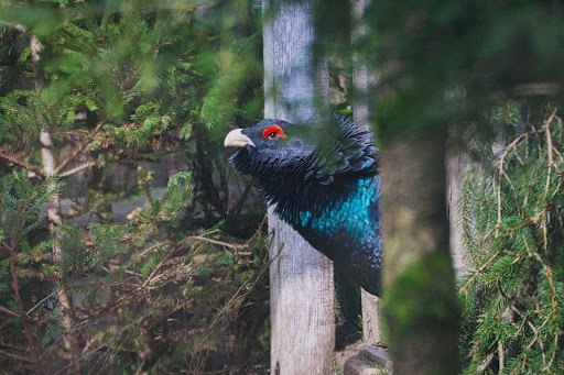 Das Gehege ist überdacht und lädt daher bei jedem Wetter zum Beobachten der Auerhühner ein. Auch Sitzbänke laden zum Verweilen und Rasten ein.
