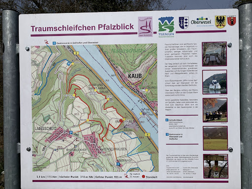 Naja für eine Rundwanderung über dem Rhein ist dieses Traumschleifchen eher nichts! Da sind andere Rundwege in diesem Bereich deutlich bis gewaltig besser! Es gibt hier lediglich 2 gescheite Blicke auf den Rhein. Dort finden sich auch Rastmöglichkeiten. Der Namengebende "Pfalzblick" liegt gar, wenn man vom Parkplatz im Ort startet gar nicht auf der Runde und muss über einen 700 Meter langen (jeweils hin und nochmal zurück) "Zuweg" angegangen werden. Durch den 500 Meter langen Zuweg (jeweils hin und zurück vom Ort aus ergibt sich somit eine Gesamtstreckenlänge von 7,5 Km. Die beiden Bergwerkstafeln/ Standorte z.B.Grube Rhein bringen auch nichts. Davon sieht man nämlich gar nichts! Die Stollen liegen weit unterhalb des Weges bis fast am Rhein unten. Zwischen den Aussichtspunkten sieht man den Rhein aufgrund des dichten Bewuchses erst gar nicht. Fazit: Von "Traum" war da wenig! Diese Rubde ist eine "erzwungene Schleife", von der eigentlich nur der Part des vorhandenen "Rheinburgenweges"...