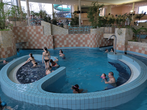 It's a great local indoor water park. Don't let the language barrier stop you, as it is a great place to wear your kids out. It's probably best for kids up to around 14. Here's the process: -An all day family pass for two adults and all your kids (yes, all of them) is around 22€ -You get these tokens. They are "tagged" to your account, so don't lose them! -You'll go through the turnstile one at a time. Wait for the light to turn green as it "logs you in", then take the token and go through. -Head downstairs. There is over big coed locker room, but with closed small changing rooms you pass through to the actual lockers. There is a side room with hair dryers by the stairs as well. Bathroom/shower areas are separated (Damen=Women, Herren=Men) after the lockers. -Available lockers have the arm bands attached to the front. Stick a token in and turn the dial. Load the locker and take the arm band with you. It has your token in it and can be used to buy food cash/card free, so lock those up. The arm band opens the locker again. Only one person needs the arm band, so don't take up a bunch of lockers. -There are three areas: spa/sauna, lap pool, and water park. Only the sauna/spa needs you to scan your arm band in, because (I think) it's a separate cost. Everywhere else is open to go to. The lap pool has a blow up obstacle course and a shallower pool for general swimming/playing. Yes, bring your pool floaties if you want. -The water park has a bunch of rotating features: wave pool, jets, bubbles, waterfalls, and whirlpool. There are a bunch of nooks to discover and explore. There is even an swim out to an outdoor pool. The water is heated, so it's actually pretty refreshing. -There are two slides. The entrance is to the bottom right as you face the water park area inside. The tube slide is with or without tube. You can just grab one from the pile at the bottom. The top "blackout" slide is not for tubes. Wait for the green light to start on the blackout slide, but go as fast as you want on the tube slide. Recommended age is 6, but no height required or staff manning the slides, so use your discretion. You can go down doubles, triples, whatever. -For food, order and just place your token or arm band on the metal box to add it to your tab. Only eat in the food area. It seemed like you could bring in some of your own food, but I didn't see any rules. -Need the bathroom? Look for "WC" which stands for water closet. That's the bathroom. -At the end, go in reverse order: lockers, changing rooms, then upstairs to turn in your tokens. If you didn't buy any food, just put them in the turnstiles to leave. To pay for food, go to the desk first. They'll scan them, you'll pay, they'll give the tokens back, and then you go out through the turnstiles. Last advice: It can get crowded. Try to avoid peak times for max...