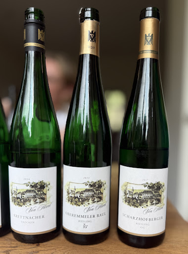 Line-up und Trinkreihenfolge: 2023 Saar Riesling trocken, VDP.Gutswein – Ein Wein mit klarer, fruchtiger Struktur 2024 Oberemmeler Riesling trocken, VDP.Ortswein – Ein perfekter Begleiter zu vegetarischen und/oder orientalischen Gerichten 2024 Krettnacher Riesling trocken, VDP.Ortswein – Vulkan und Schiefer machen einfach Spaß 2022 Oberemmeler Raul Riesling trocken, VDP.Erste Lage – Kommt daher wie ein Chardonnay, aber ohne Butterigkeit 2017 Scharzhofberger Riesling, VDP.Großes Gewächs – WOW! 2024 Saar Riesling feinherb, VDP.Gutswein – Ein Wein für jeden Tag 2024 Saar Riesling Kabinett, VDP.Gutswein – Spannend 2016 Oberemmeler Hütte Riesling Kabinett, VDP.Große Lage – Minze und wilde Kamille pur 2016 Scharzhofberger Riesling Kabinett, VDP.Große Lage – Einfach nur Passionsfrucht! Wer kann, sollte probieren – und kaufen 2023 Oberemmeler Hütte Riesling Kabinett, VDP.Große Lage – Jetzt schon feinfruchtig, aber besser erst einmal im Keller verstecken 2016 Scharzhofberger Riesling Spätlese, VDP.Große Lage – Trinkempfehlung! Darf aber auch gerne im Keller „vergessen“ werden