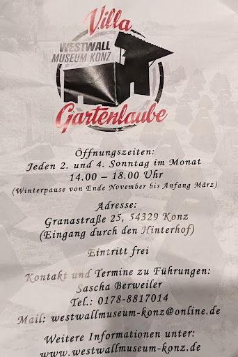 Read moreEine kleine Ausstellung von privat engagierten Personen. Der Bezug zu der Stadt Konz steht im Vordergrund. Man kann relativ viele Fotos, Waffen und Armeegegenstände anschauen. Das Highlight ist die Besichtigung des recht kleinen Bunkers. Die Führung war gut und wurde auch humorvoll vorgetragen. Die Besichtigung ist kostenlos, man kann aber einen kleinen...