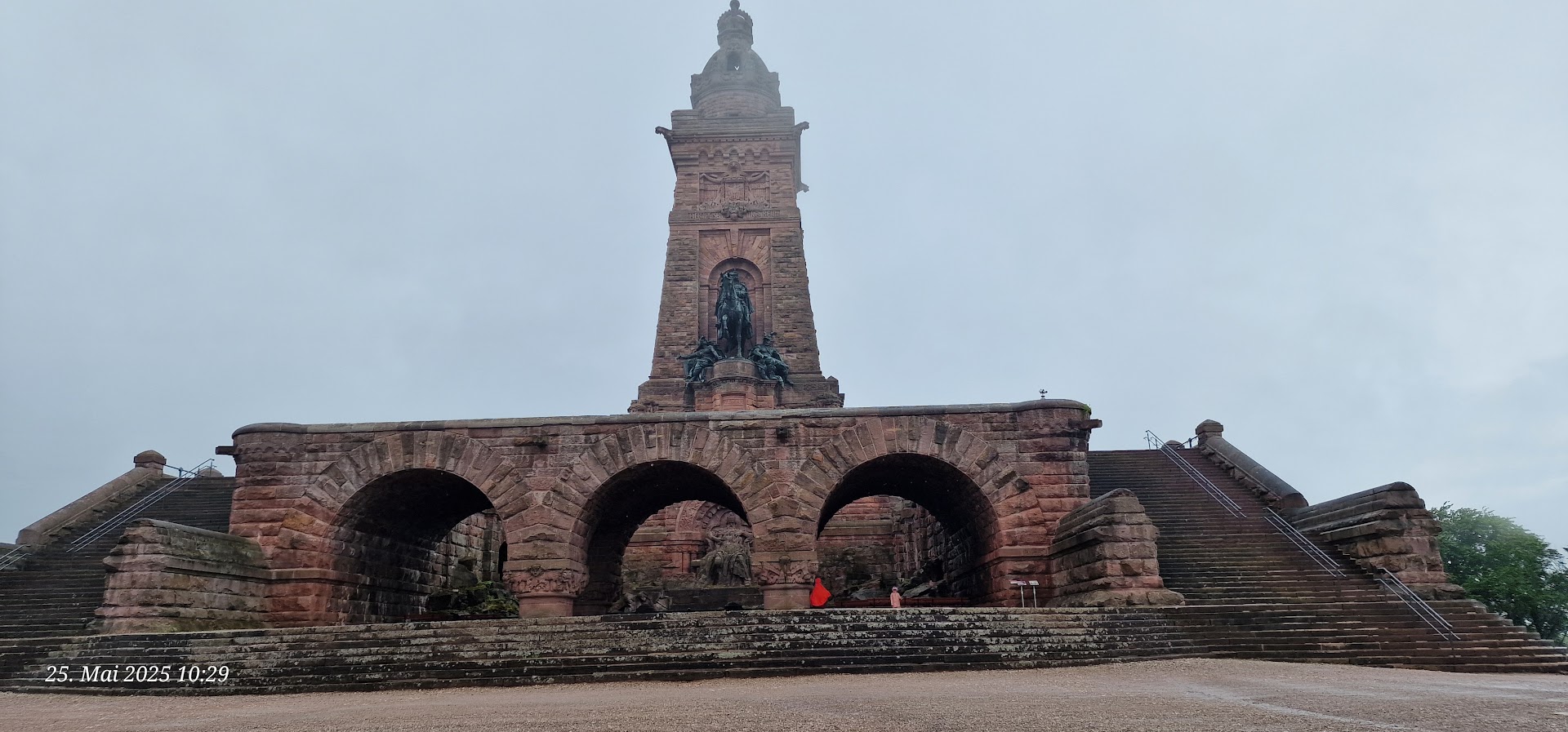 Das Kyffhäuser Denkmal, so oft daran vorbei gefahren, - als ich noch im Berufsleben stand -, hat es mich immer irgendwie neugierig gemacht. Jetzt hatte ich die Gelegenheit wahr genommen und es besucht, zwar war das Wetter nicht gerade als schön zu bezeichnen - trotzdem - ich habe es nicht bereut. Schon die Anreise war ein Erlebnis, da ich, von Norden kommend, die Autobahn so gut es ging, vermieden habe und quer durch den Harz für. Alleine dafür war es die Reise schon wert. Aber es geht ja um das gewaltige Denkmal. Wir fanden unten, am Kyffhäuser-Hotel, einen Parkplatz. Der ist öffentlich mit Parkschein. Tagesticket: 3,-€ - völlig in Ordnung. Nachdem wir kurz vorm Parkplatz noch eine liebenswerte Imbiss-Verkäuferin kennen lernen durften, wurden wir am Parkplatz auf einen ebenso freundlichen Shuttle-Service aufmerksam. Erst hatten wir eigentlich nicht die Absicht diesen Service in Anspruch nehmen zu wollen, aber weil das Wetter nicht gerade einladend war und der Fahrer ausgenommen nett- ließen wir uns zum Denkmal hinauf fahren. (2,-€, pro Person) Auf der kurzen Fahrt- etwa 3 Minuten - erfuhren wir noch Wissenswertes zum Denkmal. Im Nachhinein waren wir froh den Service in Anspruch genommen zu haben, denn der Anstieg ist nicht ohne. Oben angekommen wurde das Wetter etwas besser, aber der Turm war und blieb eher Nebelbehangen. Das Denkmal ist echt gewaltig und eindrucksvoll. Wir haben es nicht bereut hierher gekommen zu sein. Den Turm kann man übrigens auch besteigen, - durch eine Wendeltreppe im Inneren. Aber ich bin nicht mehr der Jüngste und dabei verließ mich dann doch der Mut. Nachdem wir soweit alles besichtigt haben, gingen wir zur angrenzenden "Oberburg", ins ebenfalls angrenzenden Kyffhäuser-Museum und den "tiefsten Burgbrunnen" der Welt. Alles sehr sehenswert. Nachdem wir wir uns, - ebenfalls auf dem Berg befindlichen Restaurant - etwas ausgeruht und gestärkt hatten, machten wir uns, durch den Wald, auf den Abstieg. Dabei kann man noch Reste der "Mittelburg" entdecken und was unbedingt besucht werden sollte, - die am besten erhaltene "Unterburg". Mittlerweile kam auch die Sonne etwas raus und der Abstieg zu Fuß lohnt sich schon wegen der Landschaft und ging schneller als gedacht. Auf der Rückfahrt, dann noch ein kurzer Stop am Imbiss, für einen Kaffee und einer leckeren "Thüringer" und weil die Imbiss-Verkäuferin so freundlich war und ich es Ihr deswegen versprochen habe, auf dem Rückweg, auf eine Wurst abzuhalten. PS: Was der Imbiss und der Shuttle-Service an Freundlichkeit, Hilfe und Zuvorkommenheit anbietet, sucht man im Restaurant am Denkmal allerdings vergeblich. Selten ein so unfreundliches und abweisendes Personal erlebt.