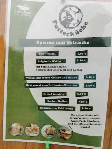 Das Arche Park "Café Futterküche" bietet immer Sonntag von 12:00 - 17:00 Uhr allen Besuchern diverse Waffelspezialitäten, selbstgebackenen Kuchen, Limo, Kaffee, Cappucino und Bratwurst im neu gestalteten Kaffee-Garten.