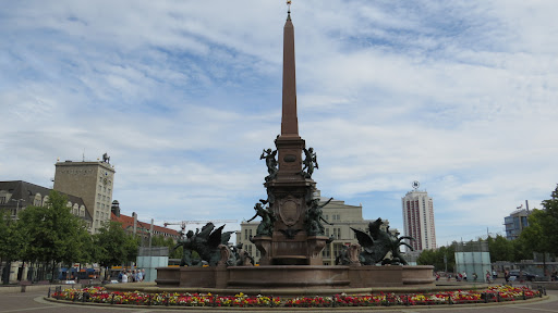 Read moreDer Mendebrunnen befindet sich auf der südlichen Hälfte des Augustusplatzes vor dem (dritten) Gewandhaus. Um einen zentralen, ca. 18 Meter hohen Granit-Obelisken gruppieren sich mehrere zum Teil wasserspeiende Bronzefiguren in einem Wasserbecken.