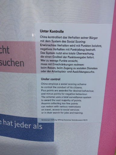 The third floor contains topical changing exhibits. When I was there, they had an exhibit on the expanding use of computers in our lives. Given the surveillance under the DDR, (see the Stasi museum in Berlin for an excellent presentation of this) this exhibit is an understandable warning about the possibilities of government overreach into the personal lives of its people. Included in this exhibit is an example of the Social Credit system in China. It is described only in German but try translating it to see the absurd Chinese government attempts at behavior modification. One way to score more points is to praise the government on social media. You will lose points if you do not visit your parents often enough. There will be consequences for those Chinese citizens with low social...