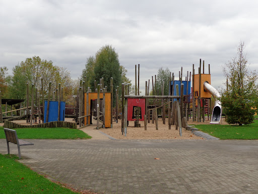 Ein schöner weitläufiger und sehr gepflegter Park. Der Spielplatz ist etwas voll gewesen, man kann aber in der ganzen Anlage verschiedenen Spielmöglichkeiten finden, die sich außerhalb Richtung Rhein noch mit einer Minigolf Anlage etc ergänzen lassen.