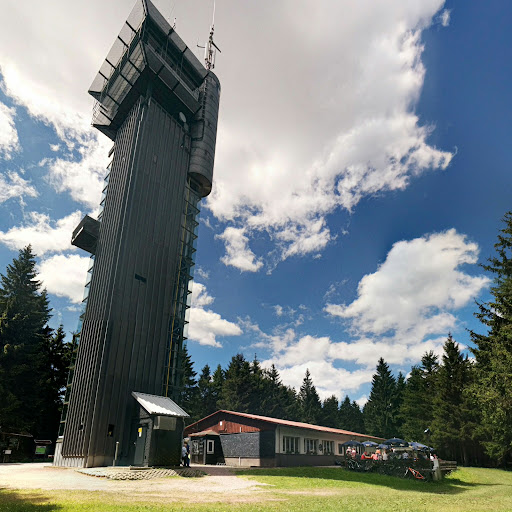 Auf dem Turm angekommen in ca. 35 Metern Höhe, hat man einen Rundumblick in die Ferne wie es ihn nur selten gibt. Aber bei 31 Grad Außentemperatur ist der Turm ein stehender Kaminofen. Es gibt im ganzen Turm kein einzige Lüftungsöffnung, wir haben nicht gefunden, die gefühlte Temperatur wurde von Etage zu Etage immer höher und oben angekommen war es kaum noch zu aushalten, gefühlt wie in einer Sauna bei 60 Grad , das Glas ringsum ist gnadenlos für die Besucher hier oben, kein Luftzug, keine Entlüftung, Hitzestau! Hier muss dringend etwas geändert werden, wer es zu spät mitbekommt, fällt oben nach 5 Minuten um. Heutzutage muss sowas nicht sein, es gibt Temperatur geregelte Lüftungen die allein funktionieren, ohne das jemand schraubt oder bedient. Es geht hier nicht um Bequemlichkeit, sondern das Wohlbefinden der Besucher. Wir sind nach 10 Minuten Rundumsicht eiligst nach unten um an die frische Luft zu kommen. Wären gern länger geblieben um den Ausblick wirklich zu genießen, kein Wunder das wir die einzige Besucher auf dem Turm waren, trotz gut besuchter Baude unten. Die meisten Besucher haben sicherlich bereits nach öffnen der Turmtür der Luft und Wärme wegen den Aufstieg schon aufgegeben. In der Baude konnten wir uns dann zum Glück mit einem Eis etwas...