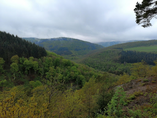 Nun wird der Wald richtig spannend: niedrig gewachsene Eichen sorgen für eine urige Atmosphäre. Dann mischen sich filigrane Kiefern dazu, die ihre Kronen in lichte Höhen strecken. Würziger Duft liegt in der Luft und goldgelbe Ginster setzen, ebenso wie die immer wieder zu Tage tretenden Felsen, Kontrapunkte zum Grün des Laubs. Den Höhepunkt erreicht diese tolle Urlaubsstimmung an der Schutzhütte am Bleiberg, wo zudem ein Rastplatz und eine geschwungene Traumliege zur Pause einladen. Unbeschwert schweift der Blick über das nahezu unberührte Nitztal und der Wegname „Eifeltraum“ beschreibt die Stimmung perfekt.