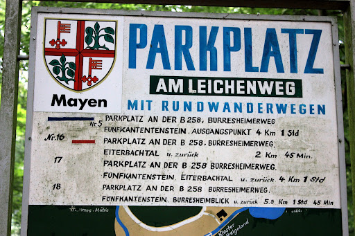 Read moreAm Startpunkt in Mayen-Kürrenberg führt ein Waldweg im schattigen Hochwald gemächlich abwärts durch das Ruppental, dann durchs Eiterbachtal mit munter plätscherndem Bach. Am Eiterbachweiher laden Schutzhütte und Bänke zum Verweilen ein. Mäßig bergan geht es zur Luisenplatzhütte mit feinem Panoramablick über Mayen, das Maifeld und Richtung Rhein. Der weitere Weg führt zur Schutzhütte Altener Tempelchen mit Blick auf die mächtigen Basaltsäulen des gegenüber liegenden Steinbruchs. Über Pfade geht es stetig bergan zum Fünfkantstein (hist. Wegemarke, mit Schutzhütte). Abwärts bieten sich großartige Ausblicke auf Schloss Bürresheim und das Nettetal. Direkt an der Nette angelangt, geht es nach kurzer Passage entlang der L83 zur historischen Hammes-mühle und weiter am Netteufer und bis zum Nitztal. Auf den Aufstieg auf dem Rücken eines Felskammes folgt eine Waldpassage durch Eichenniederwald zum Schälkopf mit schönem Blick auf Nitztal. Ein Serpentinenpfad windet sich aufwärts nach Kürrenberg. Am Waldrand entlang geht es vorbei an Pferdekoppeln und Wiesen zum Scheidkopf der Beginn des abschließenden Panoramafestivals der Rundtour mit weiten Ausblicken über die...