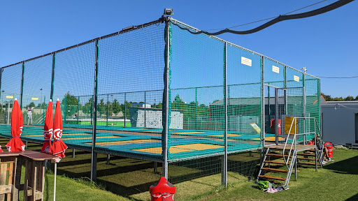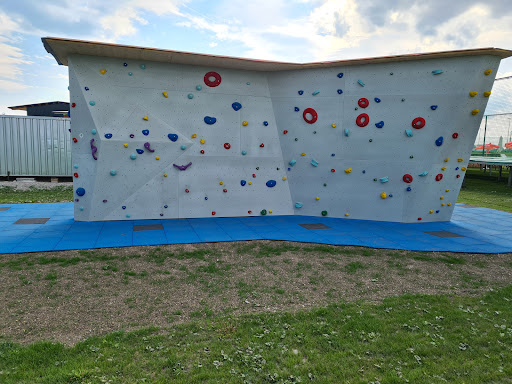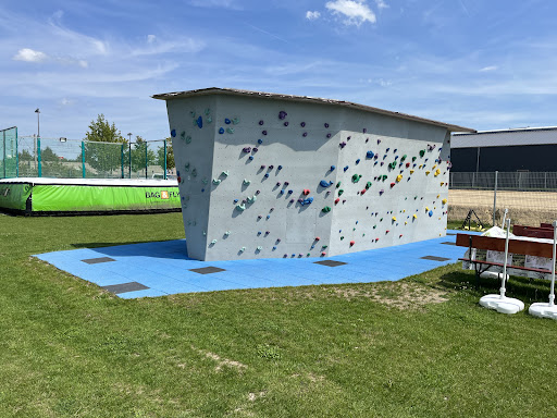 Neben Teampolinen gibt's auch eine Boulderwand und ein Beach Volleyball Feld.