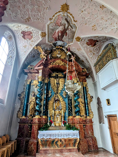 Read moreSt. Peter und Paul in Mittenwald ist eine der schönsten Kirchen die ich kenne und weist zwei Besonderheiten auf. Zum einen ist es die Lage, mitten im Ort zwischen den Häuser, nicht eingebaut, nicht erhöht und ohne Mauer drumherum. Die Straß verläuft direkt ohne Abstand vorbei Die nächste Besonderheit ist der mit Fresken verzierte Kirchturm. Ich kenne keinen zweiten in dieser Art. Matthäus Günther der aus dem Bauernhof Tritschengreith, unterhalb des Hohenpeißenbergs stammt, hat 1740 die Fresken im Innern gestaltet, fast zeitgleich mit St. Martin in Garmisch und St. Peter und Paul in Oberammergau. Zuvor hatte er die Basilika in Klosterneustift bei Brixen und Maria Hilf in Bad Tölz ausgemalt, nach Mittenwald, die Basilika in Wilten und das Kloster Indersdorf bei Dachau. Das Deckengemälde in der 'Christus unterm Thurn' Kapelle hat der Mittenwalder Johann Georg Diffenbrunner gemalt, der auch von Matthäus Günther beim Ausgestalten von Indersdorf half. Das Altarblatt des linken Seitenaltars wurde vom Mittenwalder Maler und Priester Mathias Anton Noder gestaltet. Ein interessantes Detail ist die Darstellung einer Prozession in Mittenwald, mit den bunten Kirchenröcken der Männer, des 18. Jhdts.