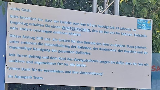 Read moreMan liebte den Aquapark für sein sauberes türkisblaues Wasser, großzügige Liegeflächen, nichtschwimmerbereich und eine große Sandfläche für die Kids zum Spielen. Leider hat sich das Terrain in diesem Jahr sehr verändert. Der Wasserspiegel wurde angehoben, an einer Seite das Ufer ausgehoben, an der andere Seite rottet das überschwemmte Gras vor sich hin, die im Wasser stehenden Bäume sterben langsam.Der kindersandstrand wurde in eine Terrasse umgebaut, den Kids bleibt sich im Matsch zu suhlen. Es fehlen gut 10m Uferwiese, wenn nicht mehr. Man schlittert durch Matsch und Schlick um schwimmen zu gehen. Durch die aufgewirbelten Schlammmassen ist das Wasser trübe und erwärmt sich massiv. Die Parkgebühren wären ok, würden Wasser und Wiese passen. Die Toilettengebühr ist einfach lächerlich und trägt vermutlich zur weiteren Verschmutzung des Sees bei. Die Vorbereitungen Eintritt zu verlangen, werden das Gesamtbild nicht verbessern. Sehr schade diese Entwicklung. In der Summe nicht zu empfehlen für...