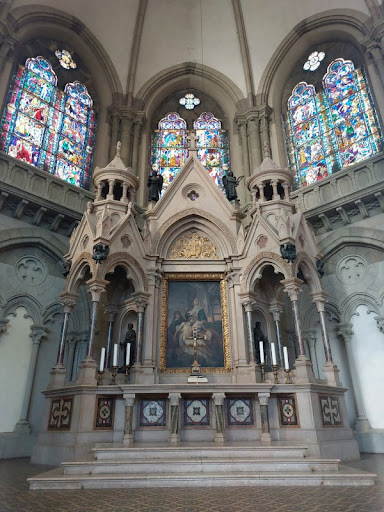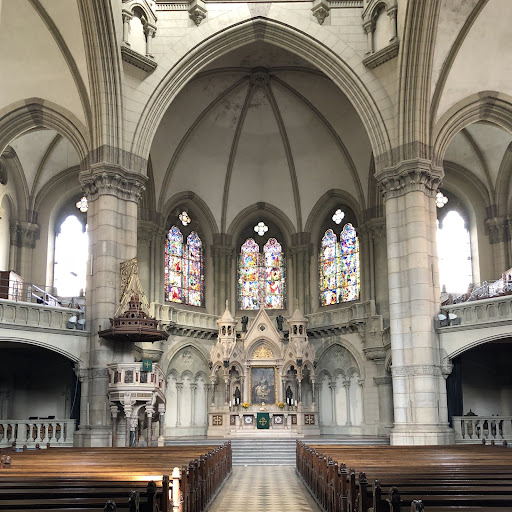 You enter the church from the main entrance from the east. Here you find a Neo-Gothic style interior laid out in the manner of a Greek cross. The main body of the church feels immense, particularly with the high ceiling. We enjoyed seeing the detailed stained-glass windows, the decorative altar and pulpit and carved wooden pews.