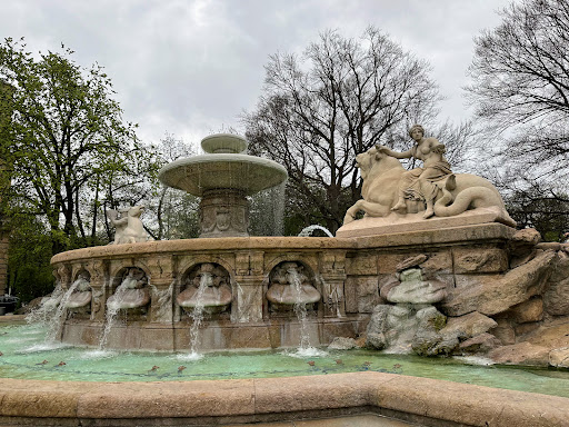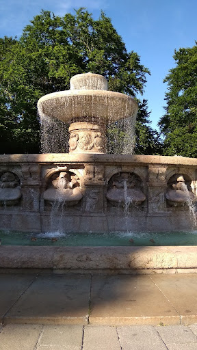 Originally built between 1893-1895 by German sculptor Adolf von Hildebrand. Here you will see a centre chalice shaped fountain which water gushing from its top and spilling into a basin. From this top level basin, water then spills into a much larger ground level basin below, through fish sculptures embedded into the fountain wall. The wall is adorned with interesting engravings. You will also see two large allegorical figures situated upon the wall, flanking the centre basin and providing compositional balance to the fountain.