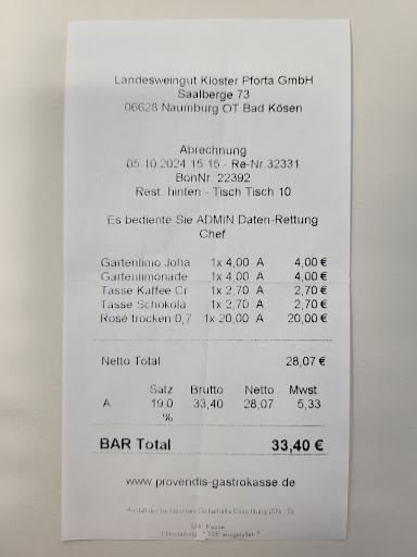Gestern waren wir in dem angrenzenden Restaurant zu Besuch. Es tut einem ja schon leid, dass das Landesweingut Kloster Pforta die schlechten Bewertungen von dem Restaurant abbekommt. Vielleicht solltet ihr euch von diesem separieren.